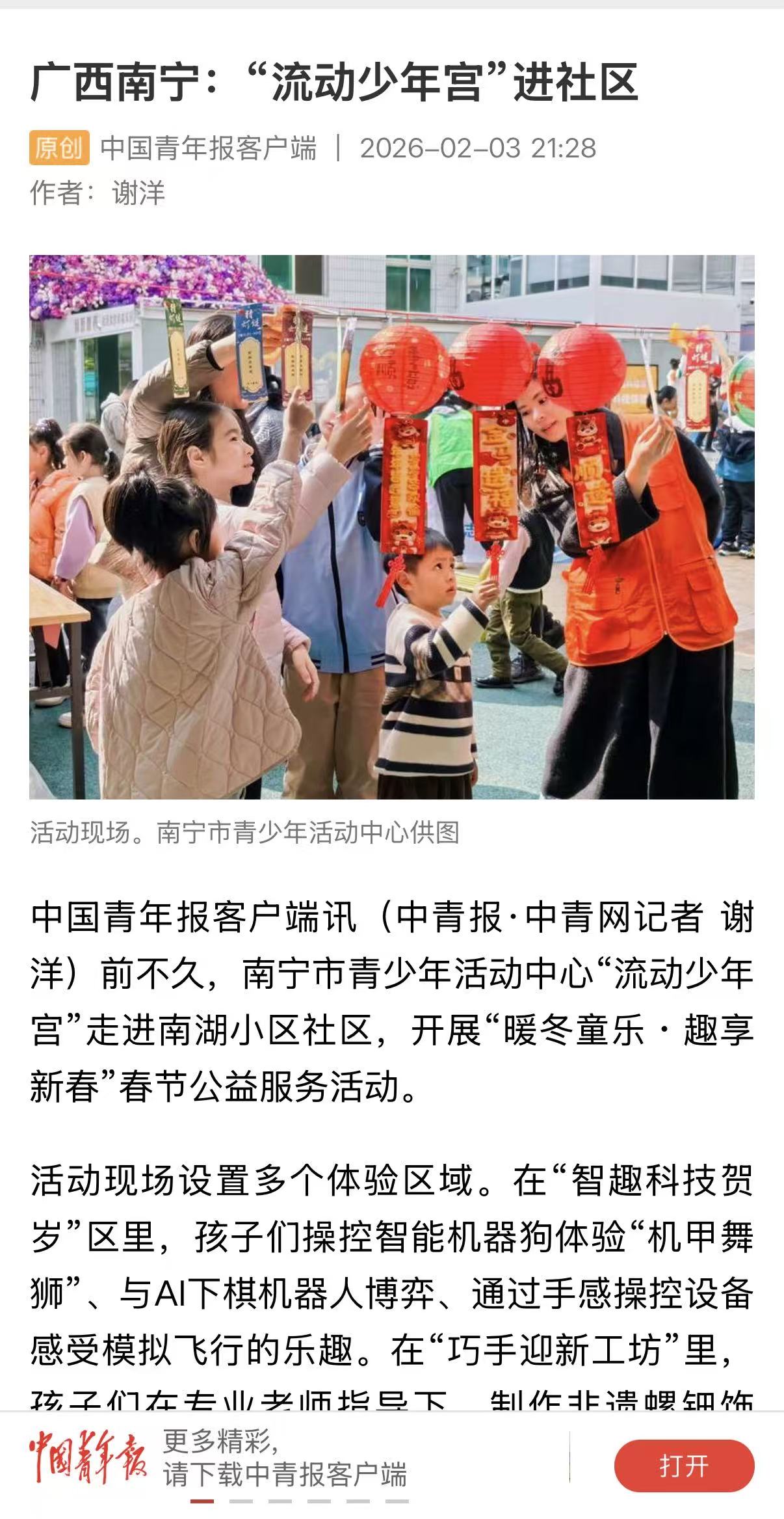 中国青年报等媒体报道“流动少年宫”走进南湖小区社区